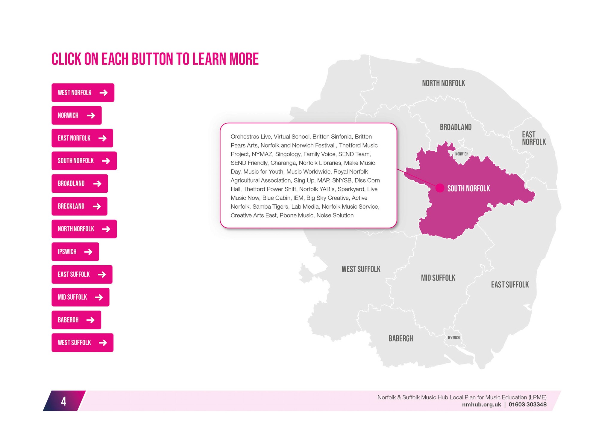 Music Hub oversee music projects with children and young people across Norfolk and Suffolk. We work together on lots of projects and the LPME (local plan for music education) is one of their key releases of the year. Working with some great photography, this project covers covers a wide area of typographic skills, infographics, an interactive map map page and it all has to look great!